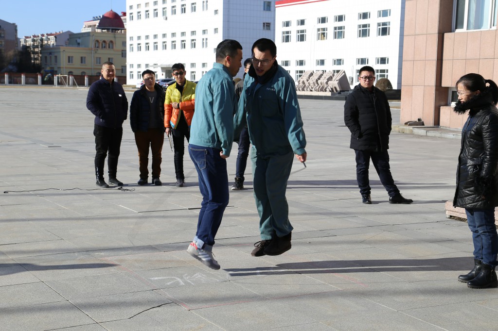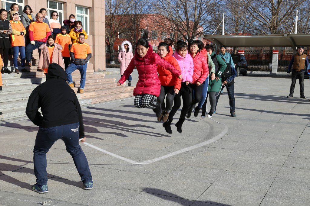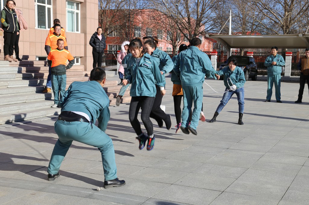 各大队不断调整战略,利用午休时间练习,争取在最短的时间赢得比赛胜利。12点20分,气温在零下5摄氏度,四支队伍服装整齐地出现前广场,无论天气多么寒冷,也抵挡不住大家对比赛的热情,无论比赛难度有多大,也抵挡不住大家获胜的决心。比赛开始了,小绳队员用最快的速度完成双人跳环节,迅速冲向大绳队员完成接力,碰撞的那刻起,大绳队员们鼓起浑身力气一起跳跃、步调一致,如六条鲤鱼一起跃过龙门。比赛结束了,但大家的激动的热情久久不能散去。