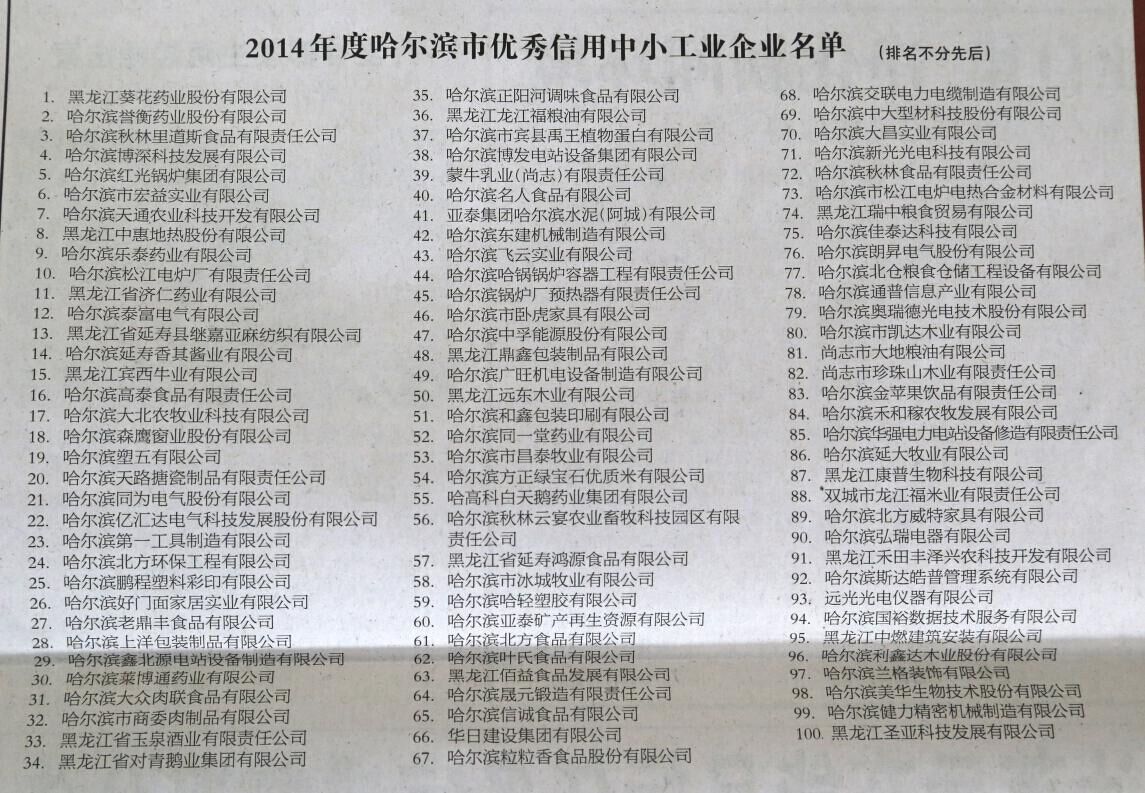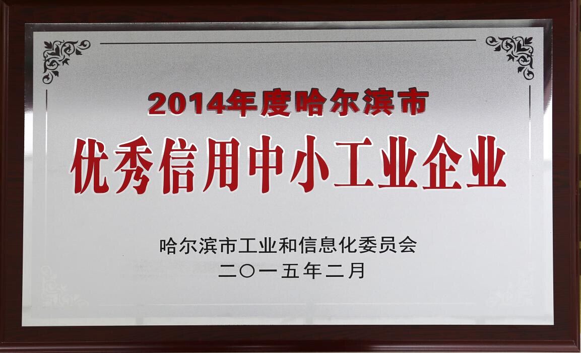 【乐泰讯】2015年2月哈尔滨市工业和信息化委员会授予我企2014年度哈尔滨市优秀信用中小工业企业。
