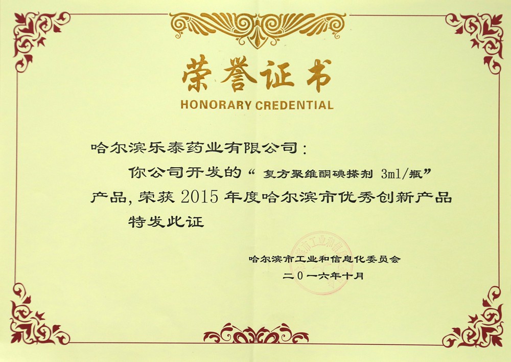 【乐泰讯】2016年10月哈尔滨市工业和信息化委员会授予我公司“复方聚维酮碘搽剂 3ml/瓶”、“葡萄糖酸锌口服溶液 10ml/瓶”两个产品为2015年度哈尔滨市优秀创新产品称号。